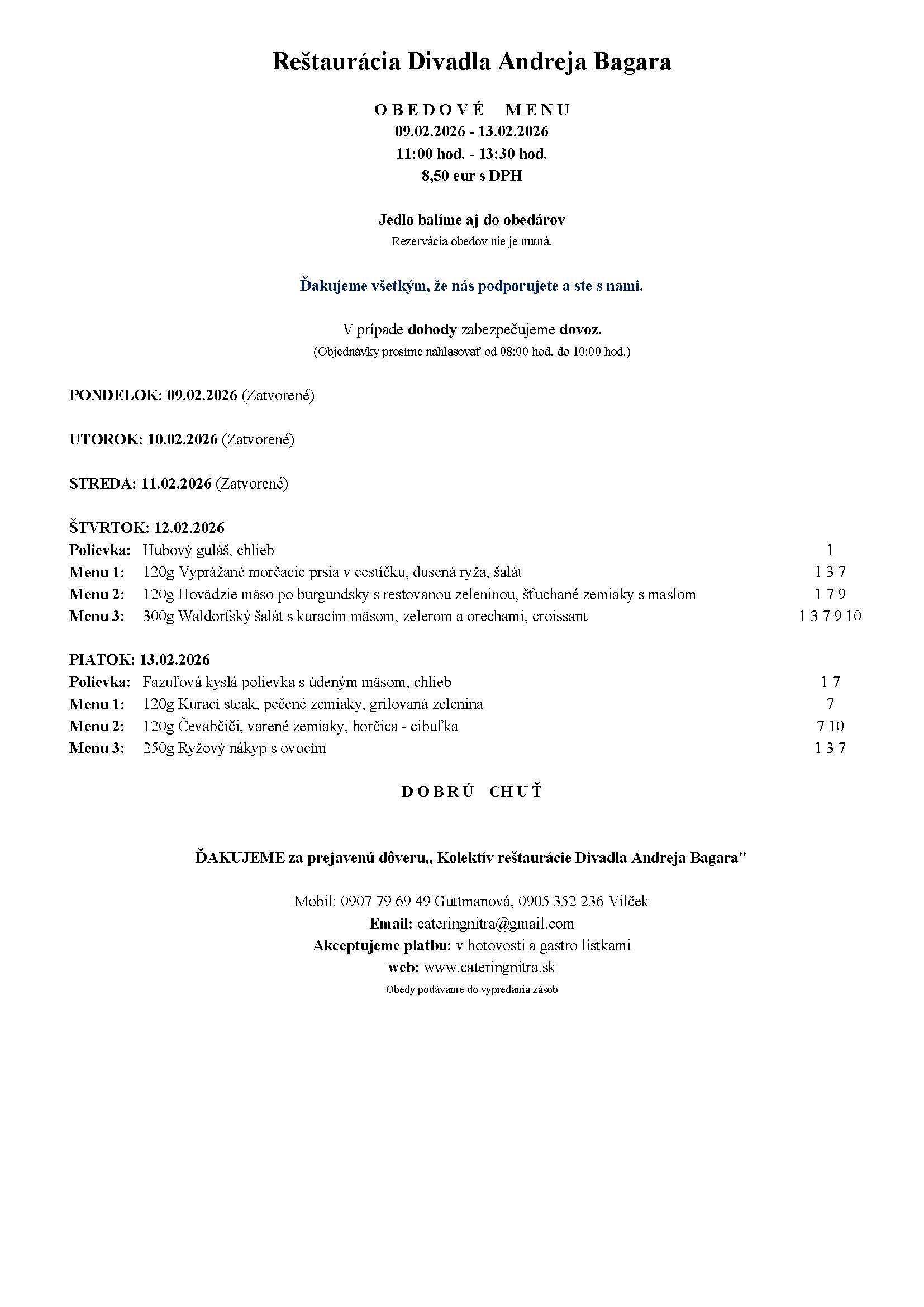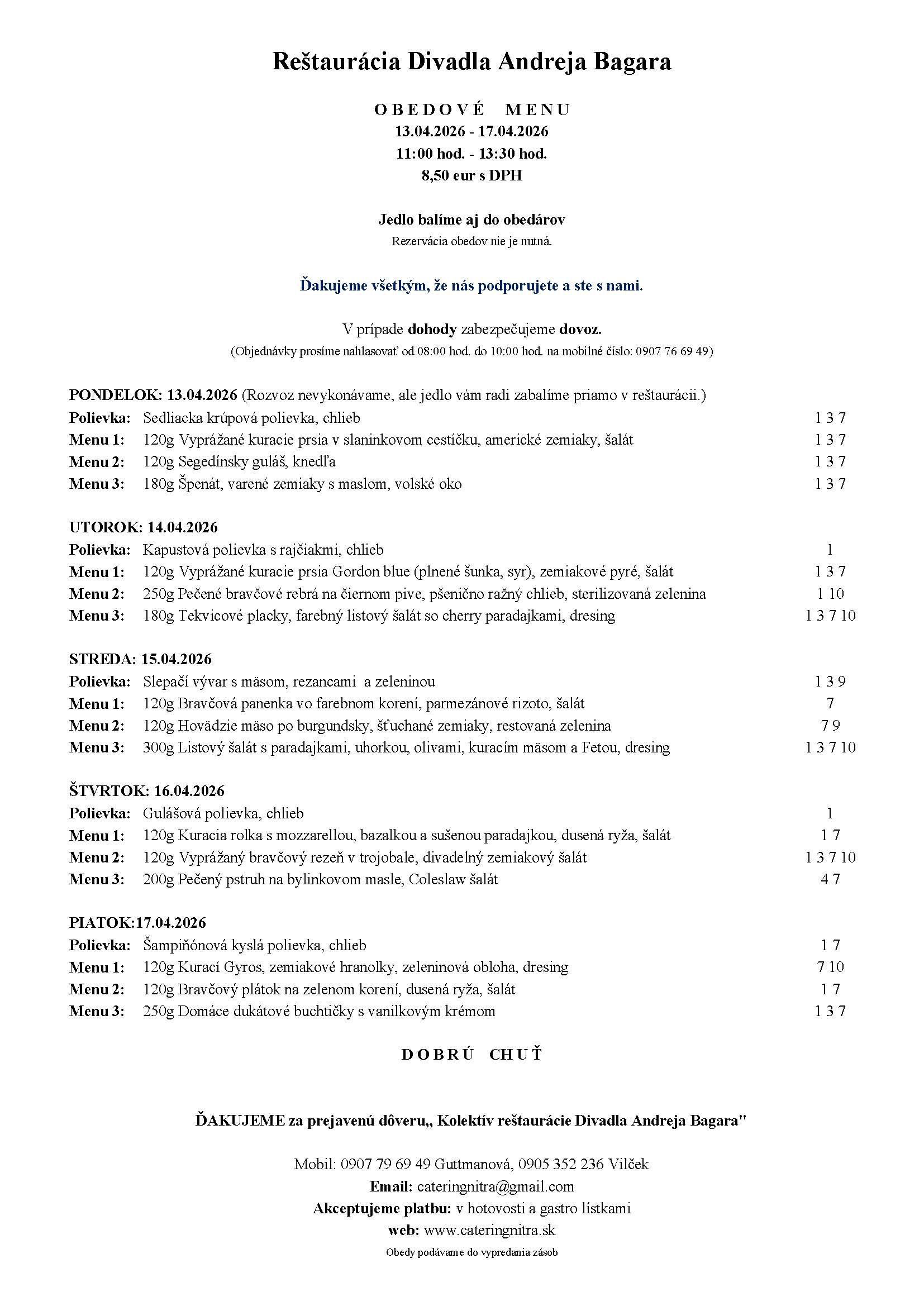 Objednávky príjmame v čase od 8:00 do 10:00, rozvoz od 11:00 do 14:30