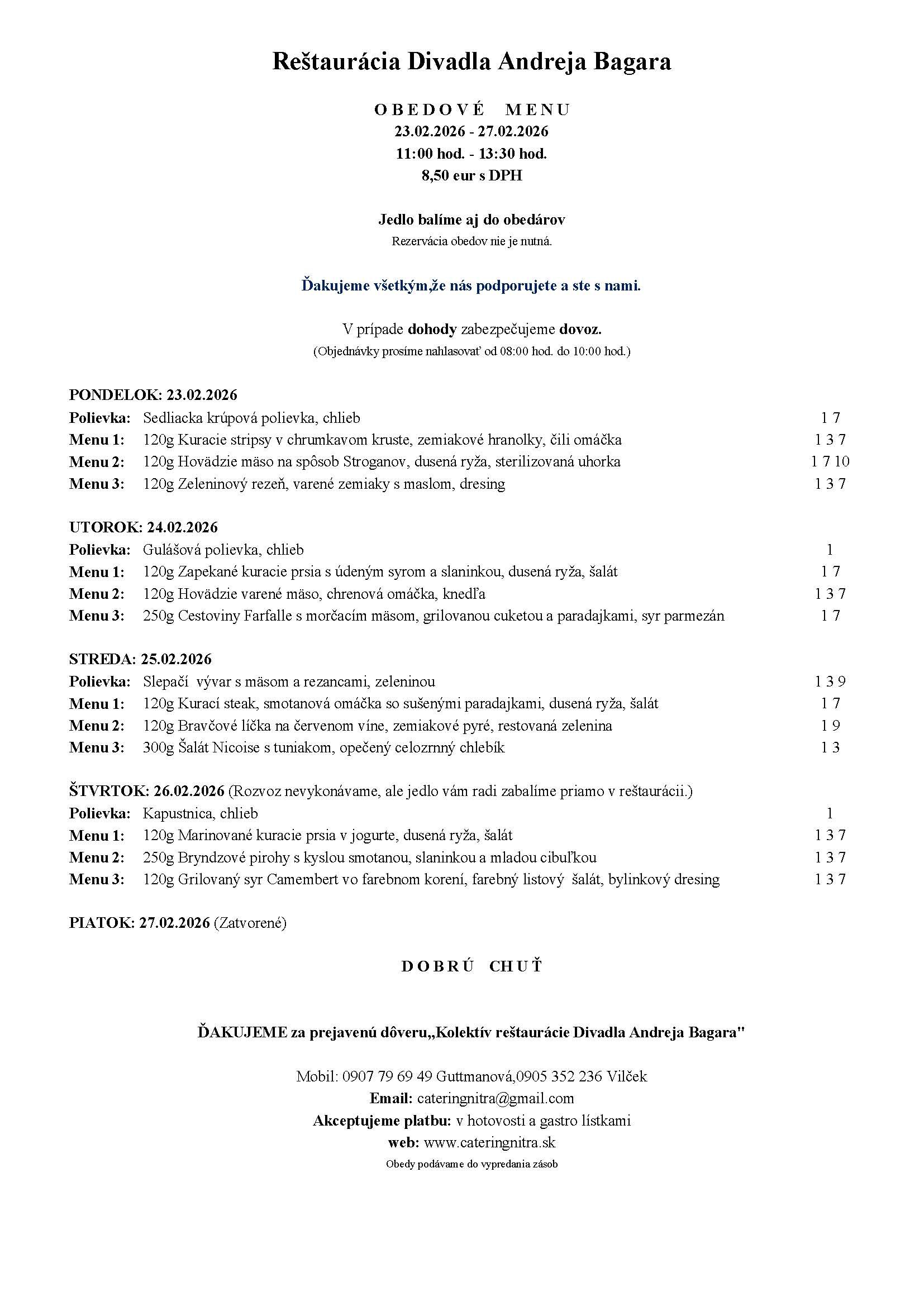 Obedové menu na rozvoz= 7 Eur (polievka+hlavné jedlo+balenie)